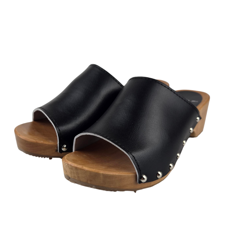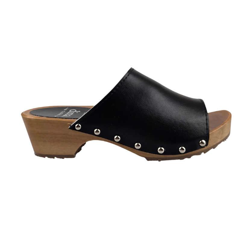 These classic Dina wooden sandals in black are stylish and durable, featuring elegant studs. Made of high-quality wood and sturdy leather, they offer a natural look combined with optimal comfort. Ideal for warm days when you want to wear a timeless and reliable sandal.